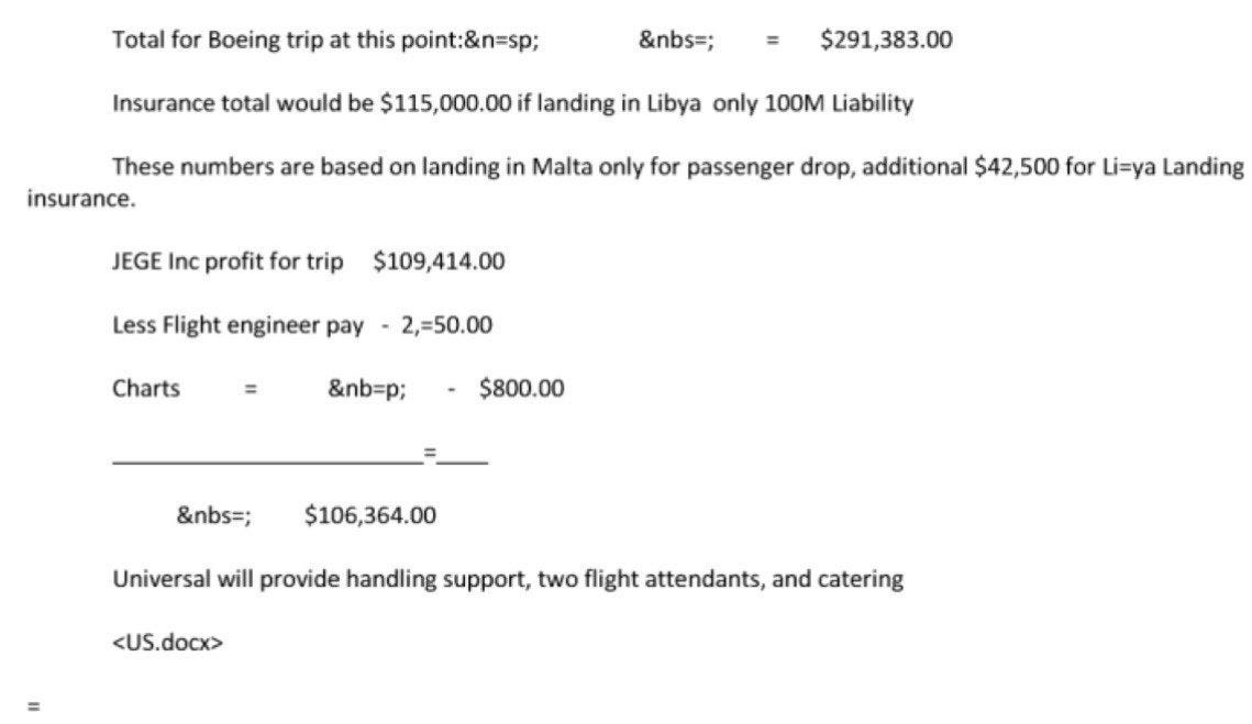 The email subject line was “Boeing 727 U.S. State Department trip,” written by a redacted sender, who seems to have been an aviation employee. It includes pricing for a Boeing “State Department trip” to be undertaken before the end of April, from Palm Beach through Malta to Libya.