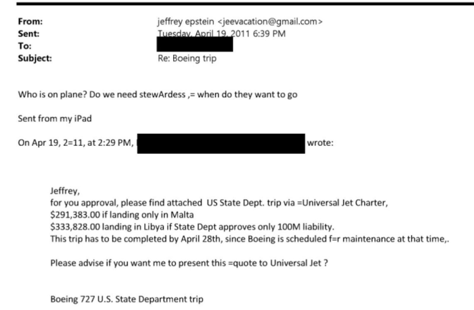 Two years after getting out of Palm Beach jail’s executive-suite sleepover camp, Jeffrey Epstein was apparently renting out his Boeing 727 – better known in later years as the Lolita Express – to the U.S. State Department to ferry unnamed employees to Libya, according to an email in the recent batch of DOJ releases.