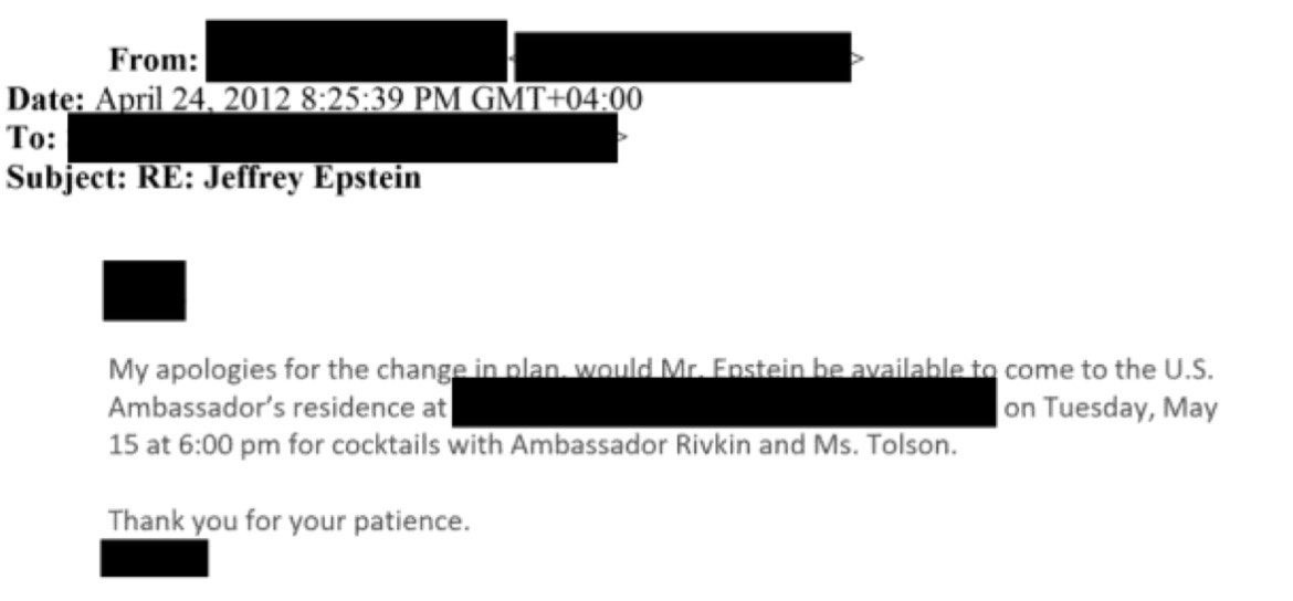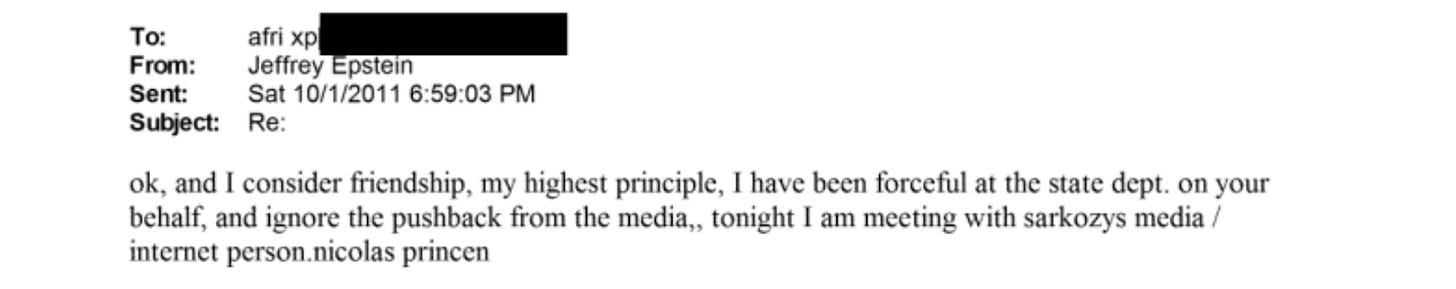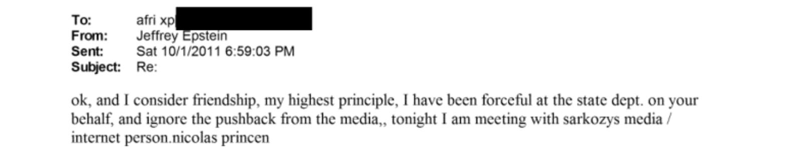 In an October 2011 email with an unknown redacted whose handle suggests a connection to Africa, Epstein wrote: “I have been forceful at the state dept. on your behalf.”