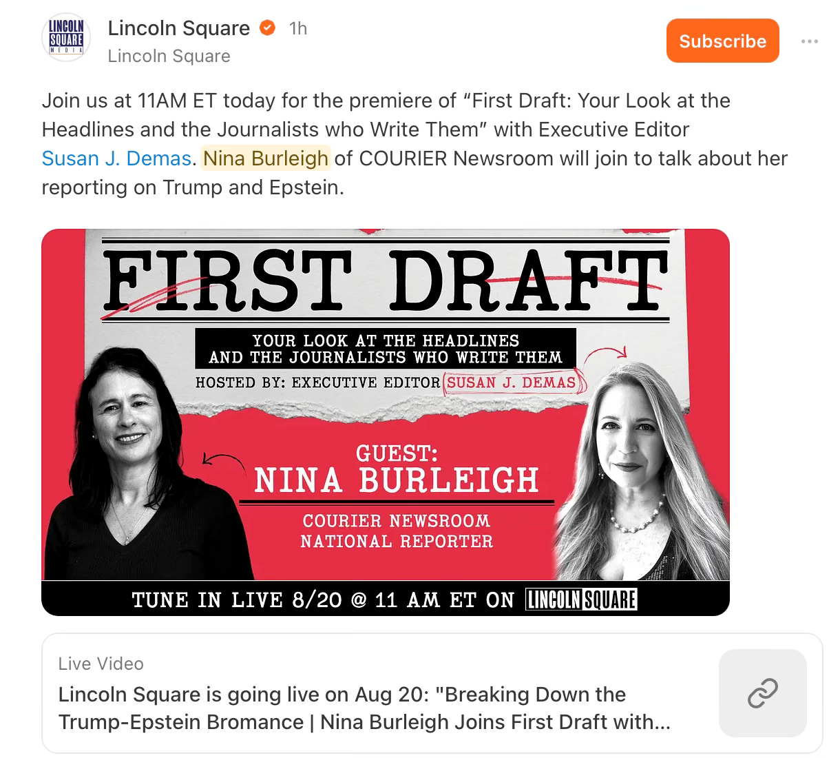 Substack Live Today at Lincoln Square Unraveling the Epstein and Trump Web with Susan J. DemasNina BurleighAug 20, 20251325ShareTune in at 11 a.m. ET: LINK. American Freakshow is a reader-supported publication. To receive new posts and support my work, consider becoming a free or paid subscriber.SubscribePreviousNext